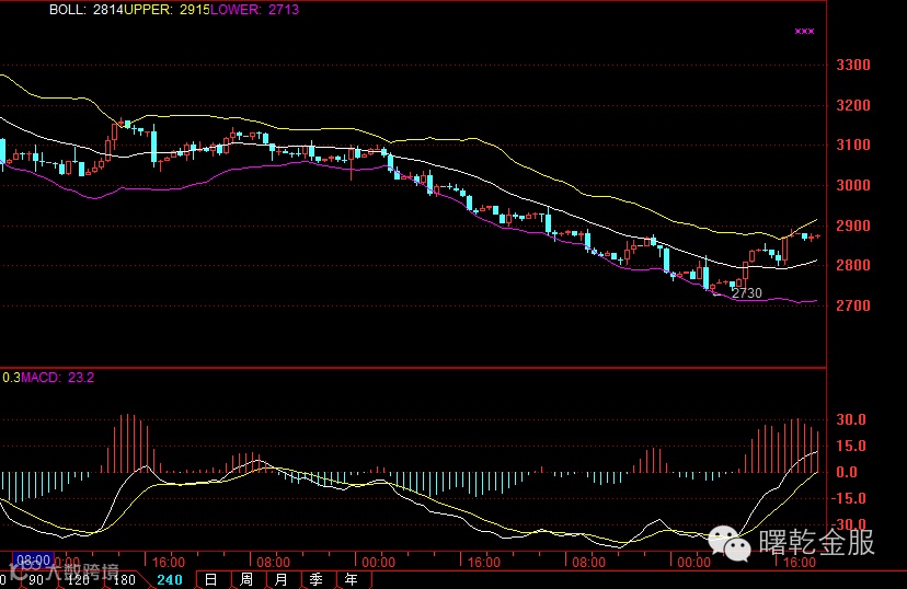 昨天晚盘行情回落试探2800一线,美盘开盘在2800一线得到支撑后,行情开始反转走多头上行行情。从技术指标看,现行情在10日均线上方,5日均线有趋头向上的迹象,意味着行情开始反转走多头震荡上行行情,KDJ继续金叉向上,MACD接近形成金叉。从4H图上看,行情处于布林带上轨运行,且方向有拐头向上迹象。今晚重点关注美国大非农数据公布,内部家人可联系分析师助理获取详细策略布局,具体的技术分析及策略操作可重点关注视频直播室。