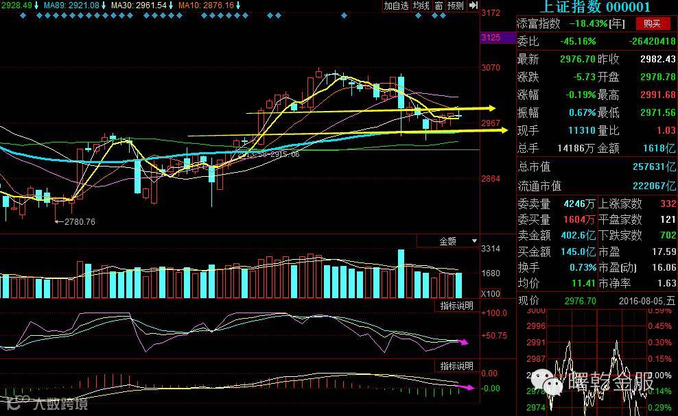 上证指数今日收缩量阴十字星,成交量不足导致冲高10日均线受阻。KDJ三线平行,并没有形成金叉,MACD虽然绿柱缩小,但依然是空头走势,后期若量能跟不上,谨防指数再度下探2950点一带。创业板收吞没阳的小阴,5日均线失守,KDJ和MACD仍没走好,大跌后连续7个交易日都未能修复前期大阴线的一部分,足以证明创业板弱势明显。