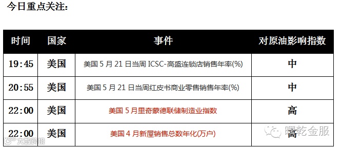 3、周一(5月23日)经济数据和基本面事件较少,市场整体交投清淡。投资者仍然热议美联储加息前景,并密切关注本周一系列重磅数据和美联储主席耶伦周五的讲话,在此之前,美指暂时震荡整理等待这些消息的指引。原油方面,油价周一小跌,此前供应中断的忧虑有所缓和,虽然技术上找不到油价下行的理由,但拥挤的多头头寸很可能限制油价进一步上行,且市场炒作焦点随时可能再度转移到供应过剩忧虑,油价维持高位震荡格局。