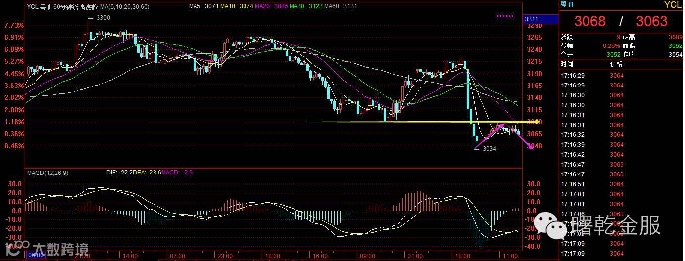 粤油在欧盘时间继续走区间震荡,还没突破上方3090压力位。从技术指标上看,日线的MACD绿柱持续放大,均线拐头向下。在1H图上,各周期的均线压制反弹力度。在4H图上,布林带下轨依然向下趋势运行,短期空头占据主动。欧盘关注3090点一带压力,若无效站不上3090点一带,行情有望再次形成一波空头趋势。今日整理思路为逢高做空为主。详细的操作点位,联系助理免费获取具体操作策略。