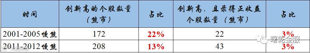 其实在“慢熊”之中股价创新高并不是稀罕事,2001-05年“慢熊”中有172只股票创历史新高,2011-12年“慢熊”中有208只股票创历史新高,在数量上占当时A股总体的比重能达到1-2成!