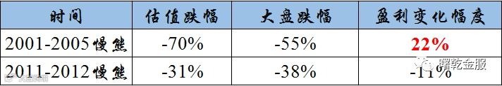 如2001-05年“慢熊”中,虽然PE的跌幅高达70%(68倍下降到20倍),但大盘的跌幅只有55%(2200点跌到1000点)!因为在这个过程中,A股5年盈利累计增长22%,帮助缓冲了估值下降对股价的冲击!