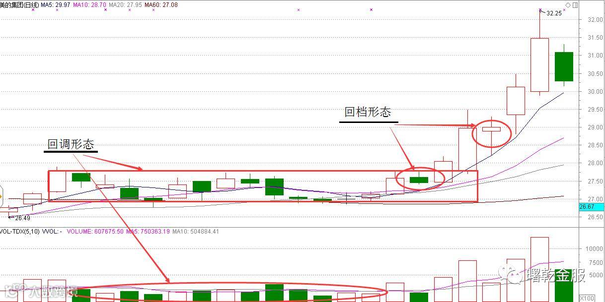 回档时成交量有大有小,不像前面说的两个形态应是缩量递减!