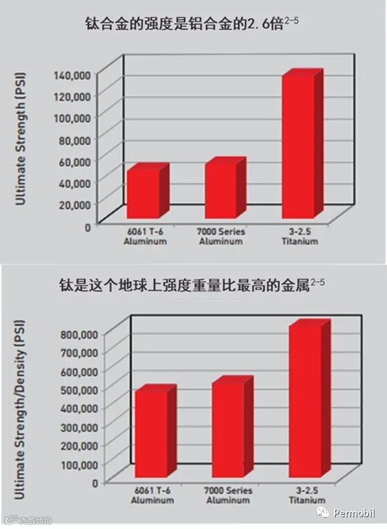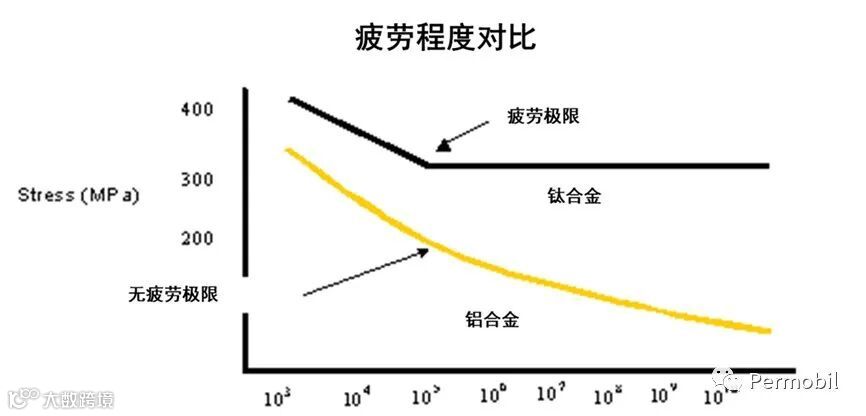 钛合金疲劳曲线在经历一段下降之后便趋于平缓,能够长时间的维持同样的性能。而铝合金随着使用的频率与时间老化,没有疲劳极限。这也就意味着,铝合金可能在使用的开始一年,性能表现与钛合金轮椅没有如此显著的差异,而在经过两三年后,性能开始明显下降,开始发生松动、异响等。