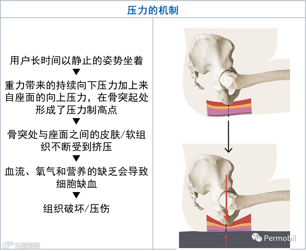 压力:当一个连续的力被施加在一个表面上时,它可能会在骨突起下产生压力制高点。随着时间的推移,这些压力会限制血液流动,导致细胞缺血,继而引发细胞死亡以及压力损伤。在坐姿状态下,压力始终存在,无法被消除,因此,我们必须关注压力的再分配,以避免在高风险区域出现压力制高点。