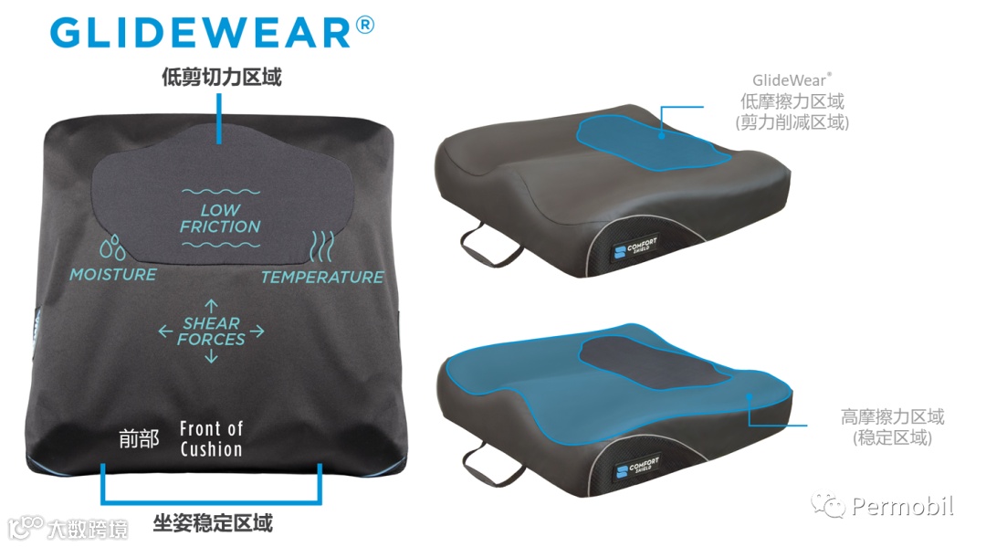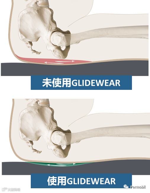NPIAP临床实践指南建议使用策略性放置低摩擦界面,以减少剪切风险。博动拥有一项名为GlideWear的低剪切力技术。这项技术应用于Comfort Embrace和M2泡沫座垫上。GlideWear被战略性地放置在剪切力高风险区域——骨盆井,在骨突出处提供一个低剪切力区。而其余部分提供高稳定性,以保持在座垫上的坐姿稳定。