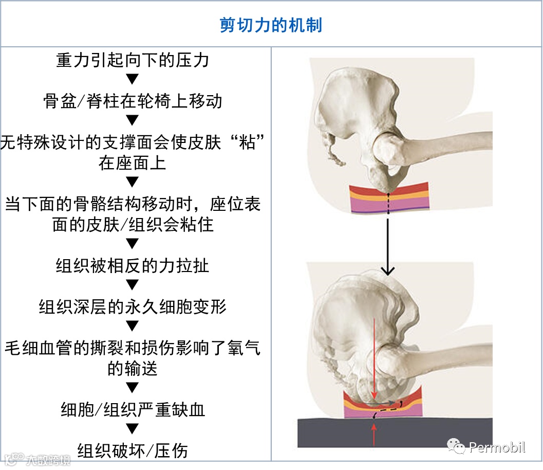剪切力: 剪切力是向下的压力和摩擦力的结合。当皮下的骨突起继续移动时,皮肤或软组织如果仍然“粘”在座椅表面,这便会导致皮肤深层的剪切力扭曲和撕裂细胞,导致细胞死亡。这些类型的伤害是由内而外发生的,一旦形成压伤,可能便是深部组织压伤,治疗难度大大增加。