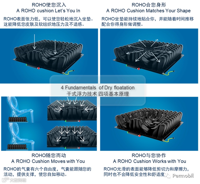 博动(Permobil)旗下另一个系列产品ROHO座垫,应用的干式浮力技术,具有以下几个特点:
