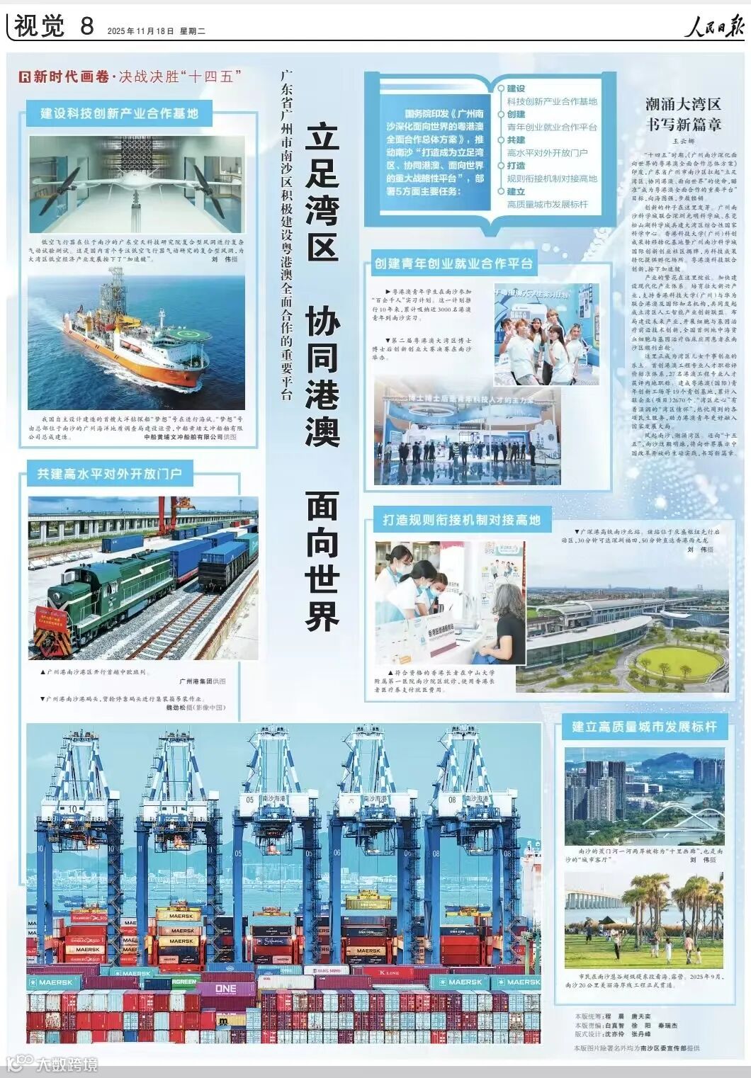 今日,《人民日报》整版刊发,聚力呈现南沙积极建设粤港澳全面合作重要平台的前沿成果与使命担当。