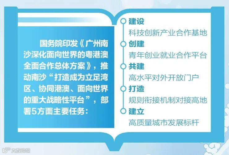 “十四五”时期,《广州南沙深化面向世界的粤港澳全面合作总体方案》印发,广东省广州市南沙区扛起“立足湾区、协同港澳、面向世界”的使命,瞄准“成为粤港澳全面合作的重要平台”目标,向海图强,步履铿锵。