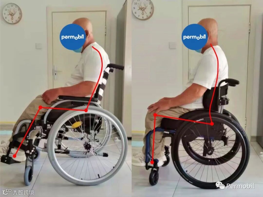 1.两台轮椅上双脚摆放的位置有很大不同——重量分配在靠近中心的位置使轮椅的推动及操作更加轻松;
