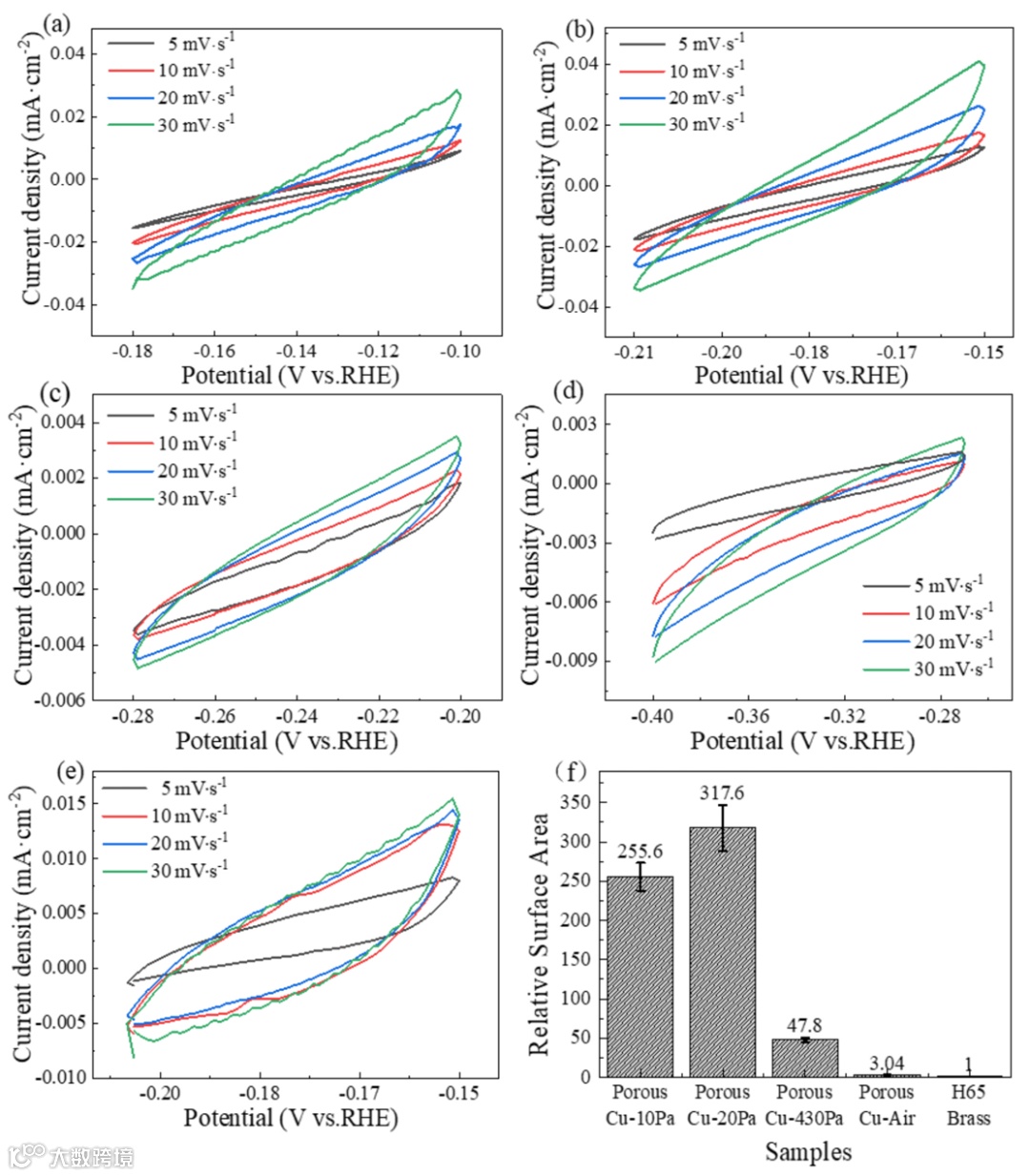 图4通过非法拉第区间CV计算双电层电容(Cdl),获得粗糙度因子(相对可接触面积)。20 Pa样品面积是黄铜的317.6倍(10 Pa是255.6倍),430 Pa骤降到47.8倍,常压仅3.04倍。这个非单调变化揭示了一个“双重竞争机制”:适度低真空降低杂质气体碰撞、增大Zn蒸汽平均自由程,促进均匀孔隙;过低真空抑制体相Zn扩散;常压导致Zn再沉积与氧化堵塞孔道。20 Pa是平衡点。