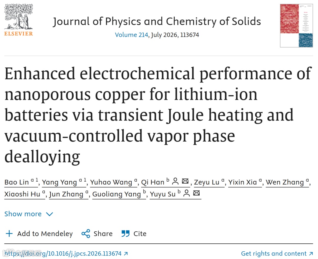 杭州电子科技大学林宝、杨阳团队和澳大利亚皇家墨尔本理工大学韩琦、苏玉玉团队,最近在《JMST》上发了一篇,用瞬态焦耳热+真空调控气相脱合金,毫秒级内把H65黄铜箔变成纳米多孔铜。他们系统研究了真空度(10 Pa、20 Pa、430 Pa、常压)对脱锌效率、孔结构和表面氧化的影响,发现20 Pa是最优窗口——残余Zn含量最低(11.69%)、90%孔径<40 nm、相对可接触面积是黄铜的317.6倍。
