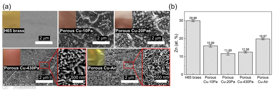 图2a的SEM:原始黄铜光滑;10 Pa时晶界出现稀疏孔隙;20 Pa时孔结构致密均匀(90%孔径<40 nm);430 Pa及常压下孔隙粗化、形状不规则。光学照片里,常压样品呈黄金属光泽——暗示Zn氧化和再沉积。