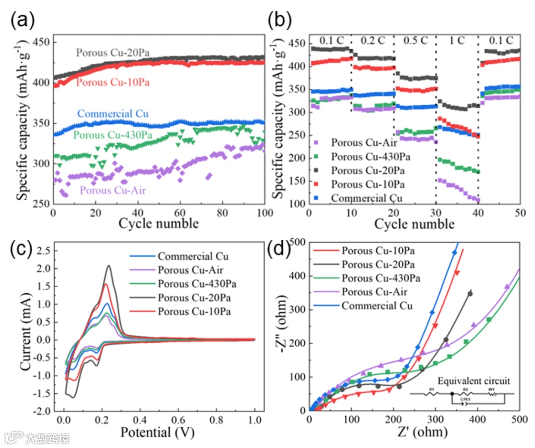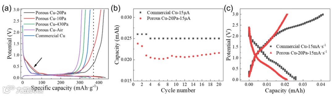 图5a是0.1 C充放电曲线:Porous Cu-20Pa比容量435 mAh/g,10 Pa样品420 mAh/g,商业铜箔仅350 mAh/g。石墨理论容量是372 mAh/g,20 Pa样品超出15.6%,10 Pa超出12.9%。