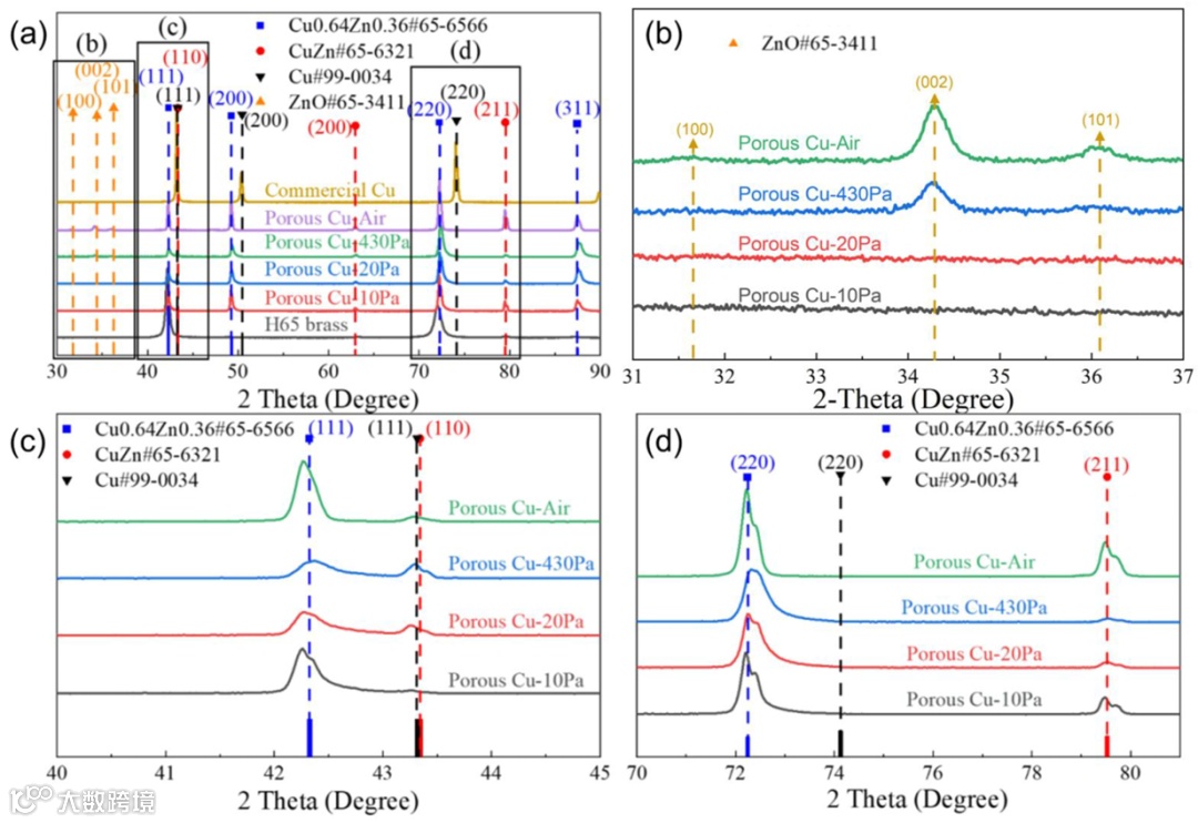 图3的XRD,热处理后出现ZnO、CuZn、Cu₀.₆₄Zn₀.₃₆峰。ZnO峰强度随压力升高而增强(常压最显著),是残余氧气氧化了Zn。局部放大图3b-d显示,Cu₀.₆₄Zn₀.₃₆的(111)、(220)峰右侧有亚峰,其强度变化与Zn含量趋势一致(20 Pa最弱)。(111)峰位从10 Pa到20 Pa右移(晶面间距减小),随后左移——晶体学独立验证了Zn残留先减后增的非单调行为。