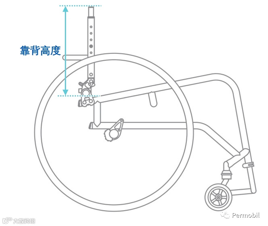 合适的靠背高度在一台高活动型轮椅上,在坐姿稳定及上肢推行功能两个维度中扮演着非常重要的角色。其量测方式为靠背顶部至座面底部(座管上方)的距离,我们需要选择一个适当的高度——这个高度必须足够高以提供身体需要的姿势支持,并且同时足够低以促进上肢功能的发挥。
