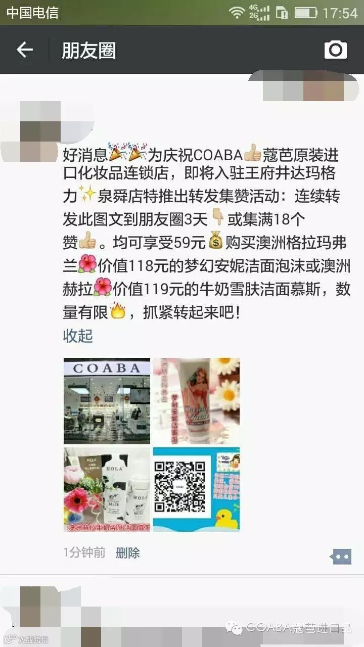 好消息!!!为庆祝COABA蔻芭原装进口化妆品连锁店,即将入驻王府井达玛格力,泉舜店特推出转发集赞活动:连续转发此图文到朋友圈3天或集满18个赞。均可享受59元购买澳洲格拉玛弗兰价值118元的梦幻安妮洁面泡沫或澳洲赫拉价值119元的牛奶雪肤洁面慕斯,数量有限,抓紧转起来吧!
