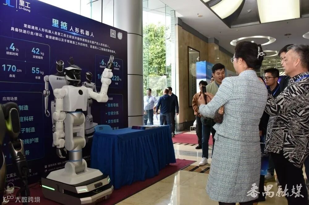 在番禺区内企业里工实业公司展示区,人行机器人展示吸引了众多嘉宾驻足观看。
