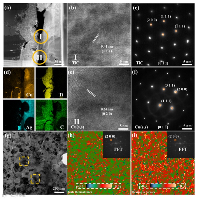 几何相位分析(GPA)显示:焦耳热工艺下 (200)TiC 晶面应变显著低于真空钎焊。