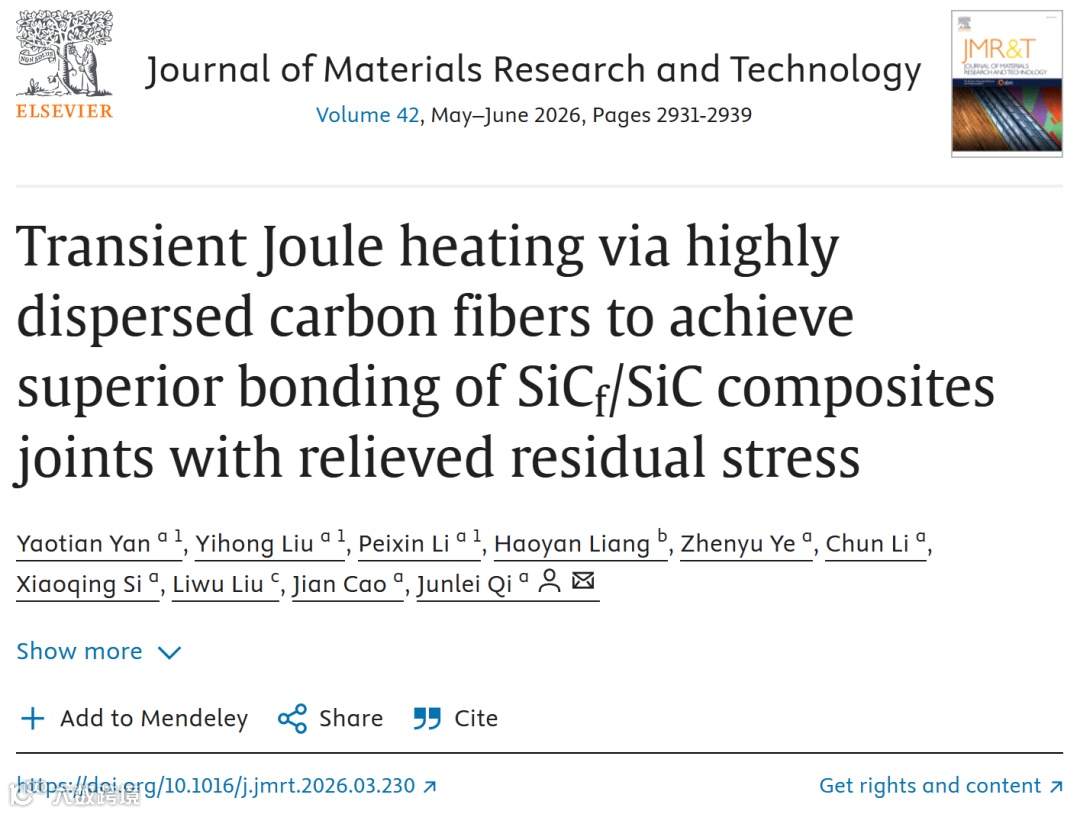 标题:Transient Joule heating via highly dispersed carbon fibers to achieve superior bonding of SiC_f/SiC composites joints with relieved residual stress