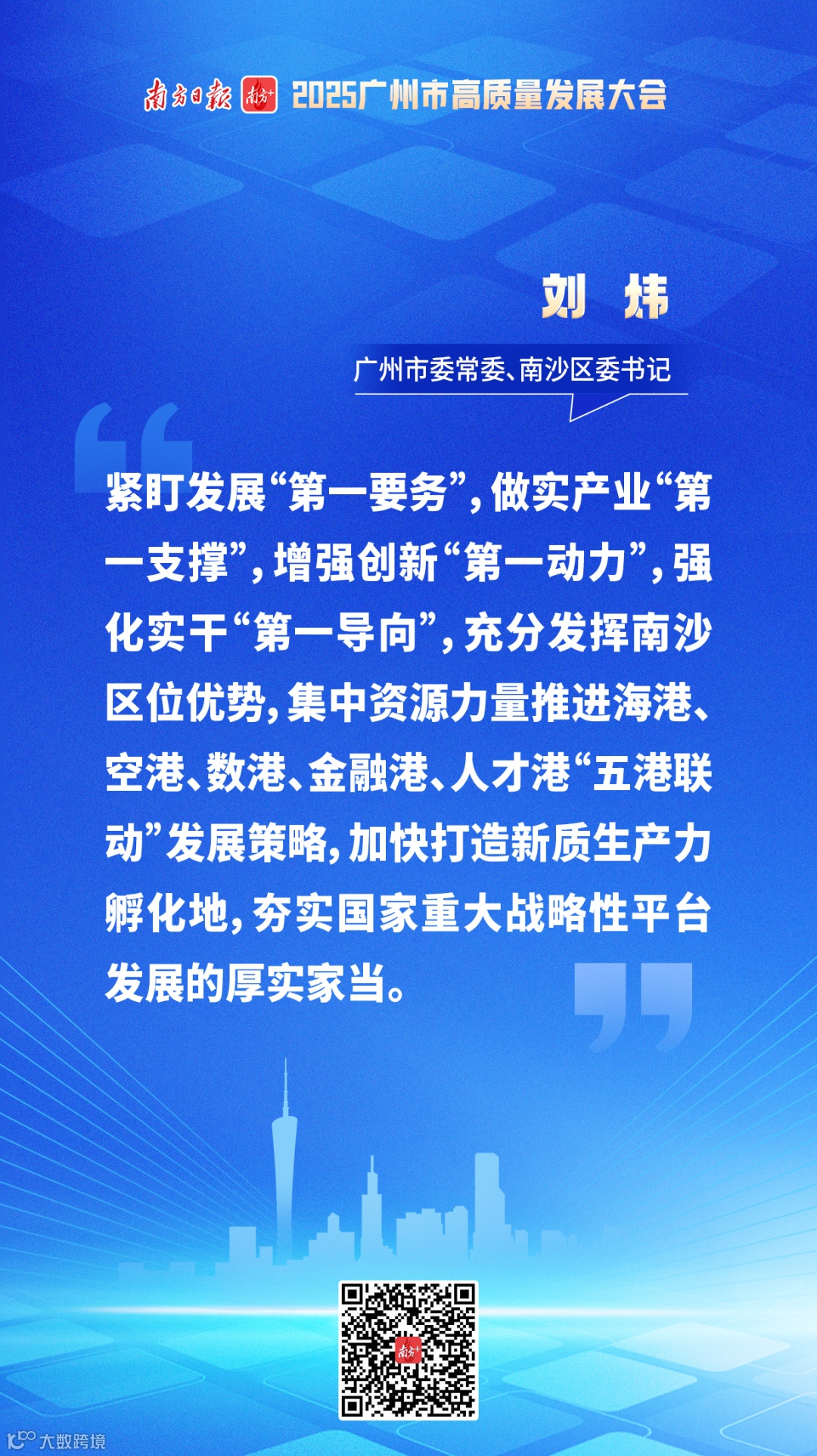 会上,广州市委常委、南沙区委书记刘炜表示,2025年是《南沙方案》第一阶段目标中考之年、南沙自贸区建设十周年、南沙建区二十周年,南沙将坚决落实中央和省、市部署要求,紧盯发展“第一要务”,做实产业“第一支撑”,增强创新“第一动力”,强化实干“第一导向”,充分发挥南沙区位优势,集中资源力量推进海港、空港、数港、金融港、人才港“五港联动”发展策略,加快打造新质生产力孵化地,夯实国家重大战略性平台发展的厚实家当。