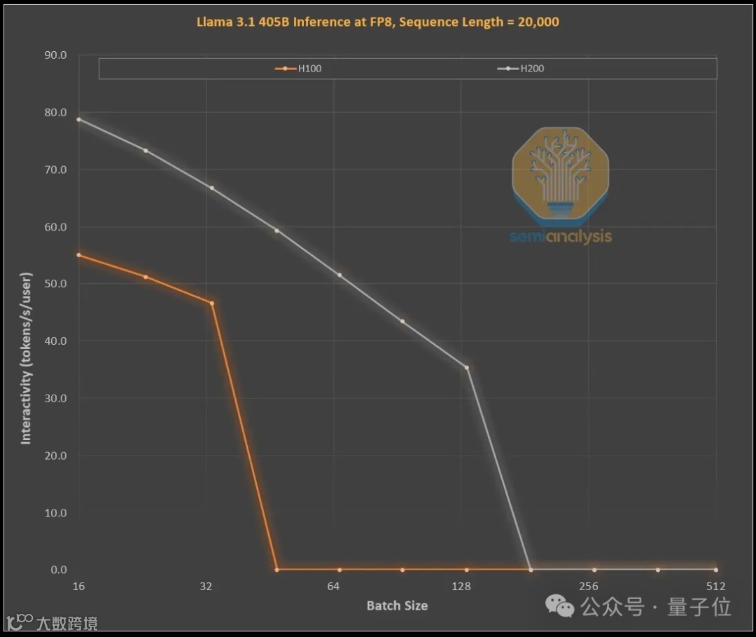 下图是在不同批处理大小下,使用H100和H200两种GPU处理长序列时,Llama 3.1 405B在FP8精度下的处理速度。