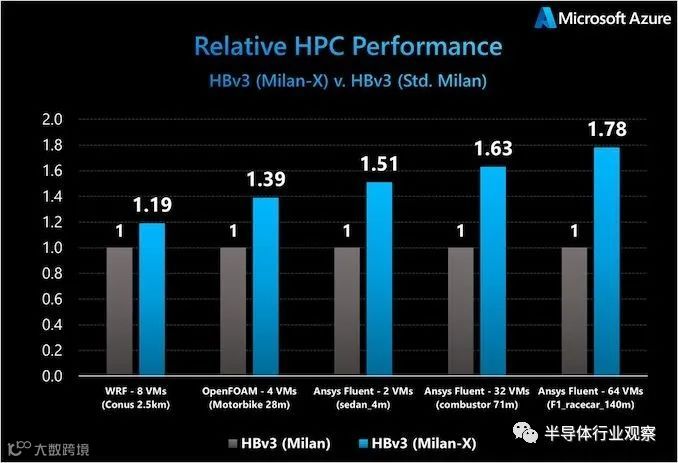 时发现了类似的情况。当时,该公司发布了一些内部测试的性能数据,主要针对与 HPC 相关的工作负载。将 Milan-X 直接与 Milan 进行比较,Microsoft 在其 HBv3 VM 平