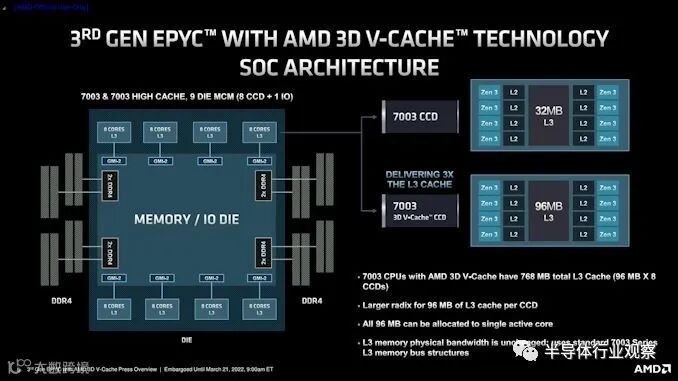 时,消费者将有机会在下个月获得一些支持 AMD V-cache 的 CPU 。桌面处理器基于单个 CCD,可提供高达 96 MB 的三级缓存,所有这些都与更大的 EPYC 芯片形成鲜明对比。