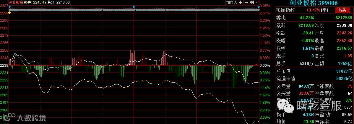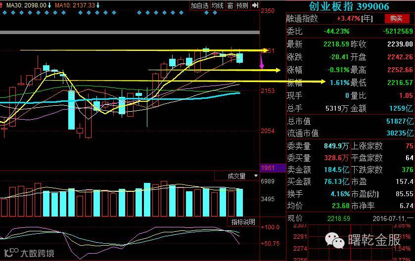 上证指数今日收出带上影线的射击之星,K线已经连续2个交易日收在5日线下方,上引线足够长也显示了短线上有调整的信号,KDJ继续下行,30分钟图上的M字头已经跌破了颈线,且顶背离依然存在。后期继续调整,回抽2950点夯实基础预估是大概率事件。创业板收阴线,再次收在5日线下方,且已跌破10日均线,均线有拐头向下趋势。2260点压力位5个交易日突破不了,证明2260点压力重重。从30分钟图上看已经跌破MA60支撑,KDJ没有收敛,有继续探底的趋势。