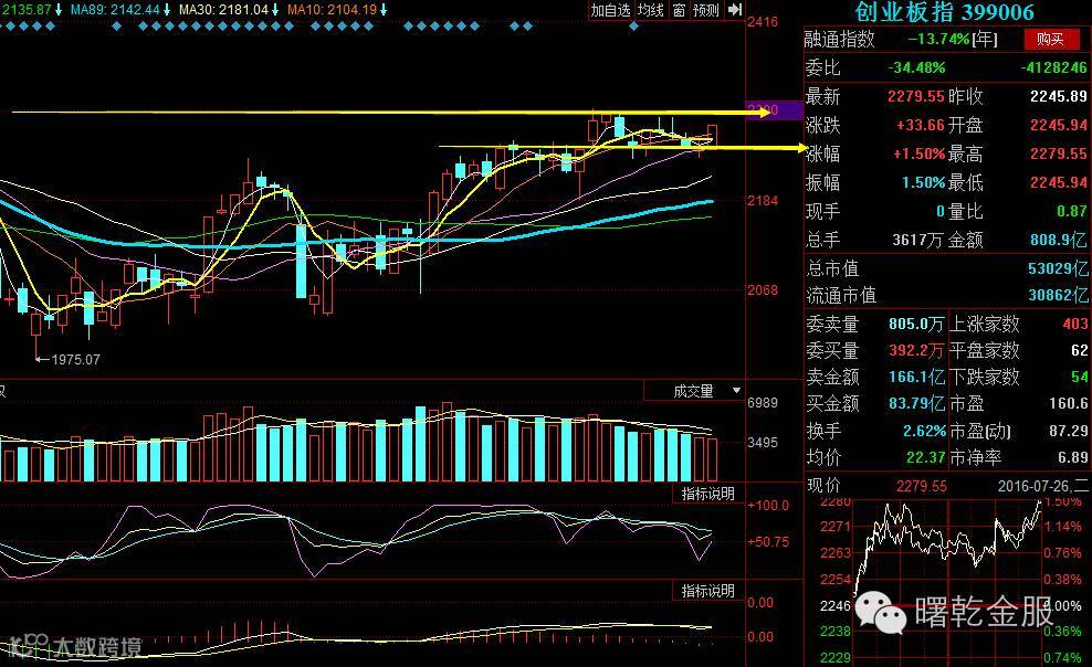 上证指数今日收缩量中阳,重新站上5日和10日均线。日线KDJ有金叉趋势,MACD依然走得纠缠。一阳穿两线的突破固然让人惊喜,但近在咫尺还有3065和前期高点3097的压力。创业板虽然今日也收阳线,各周期均线依然向上走势,但成交量严重不足,想用这样的成交量突破2300,基本没可能。