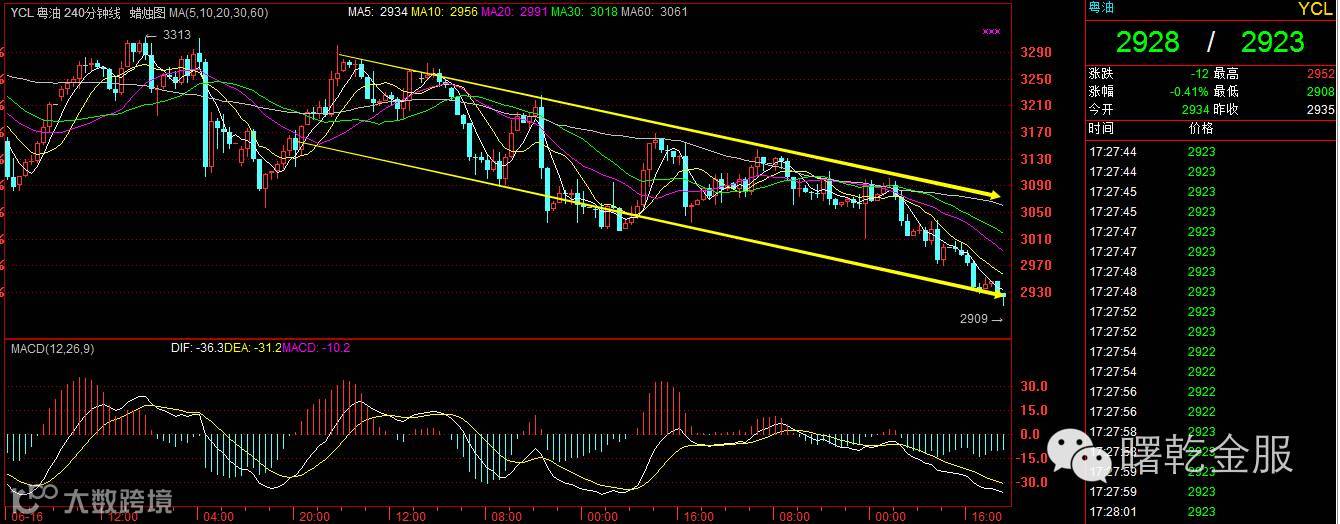 粤油日线昨日收中阴破新低,3连阴,下行趋势完好,布林带向下开口运行,空头依然占据优势。从周线上看,已经跌破中轨支撑,弱势继续下行。从4H图上看,各周期均线全部向下空头反散,反压力量较强。自跌破下降三角形后跌跌不休,阶梯式下行,高点不断下移,下行风险加剧。