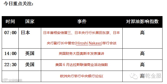 2、美国油服贝克休斯公布的数据显示,截至6月24日当周,美国原油钻井平台数量大减7口,降至330口;美国钻井总数减少3口,降至421口。此前美国原油钻井数量已连续3周上升,此次原油数量的削减结束了前期持续上涨趋势,但是在英国脱欧情况下,短期内预期国际原油价格仍将承压震荡。