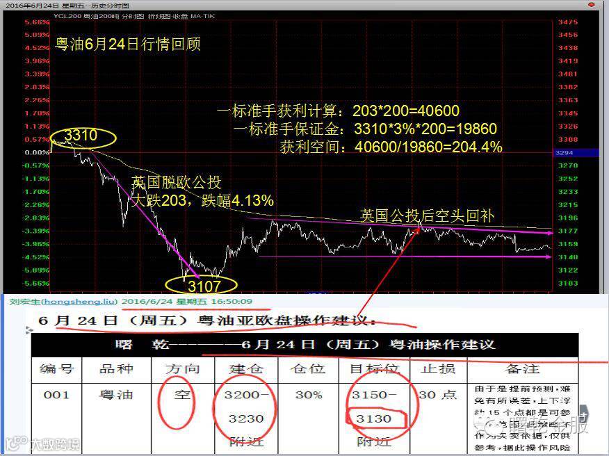 上周五因英国公投事件影响,导致全球经济恐慌情绪恶化,致使美元,黄金,白银大涨,其他货币狂跌,英镑跌幅创货币之首,大跌1800多点,粤油大跌200多点,直到欧盘期间,公投结果尘埃落地,粤油行情有所反弹,最终收盘于3150,给空头趋势增加不少信心。