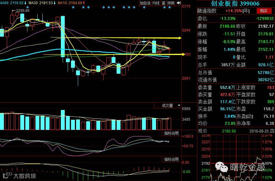 上证指数与创业板今日收线很有意味。上证指数收带有长下影的锤子阴线,盘中下探到20日均线受到支撑,而上方5日均线不断压制指数反弹空间。日线的KDJ继续拐头向下,MACD仍在顶背离构筑中,短期内存在一定的技术性风险。30分钟级别跌破昨日长下影线,位于下降楔形下轨的下方,弱势特征一览无遗,所以不排除继续调整。创业板却收出带有长下影的锤子阳线,长长的下影线意味多空双方展开了厮杀,最终以多方略占优势。但日线MACD和KDJ走势纠缠,均线也面临方向性选择,量能持续低迷令指数反弹高度有限。总体来说创业板依然看主板脸色吃饭。