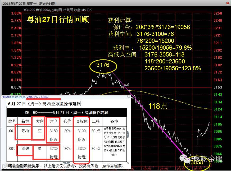 受英国退欧影响,行情 继续延续了周五的走势,虽有所反弹,但最终还是以高空的行情走势出现,价格跌至最低点为3056,跌破前期低点3081点位,收盘于3100附近,形成了一跟小阴十字星形态。