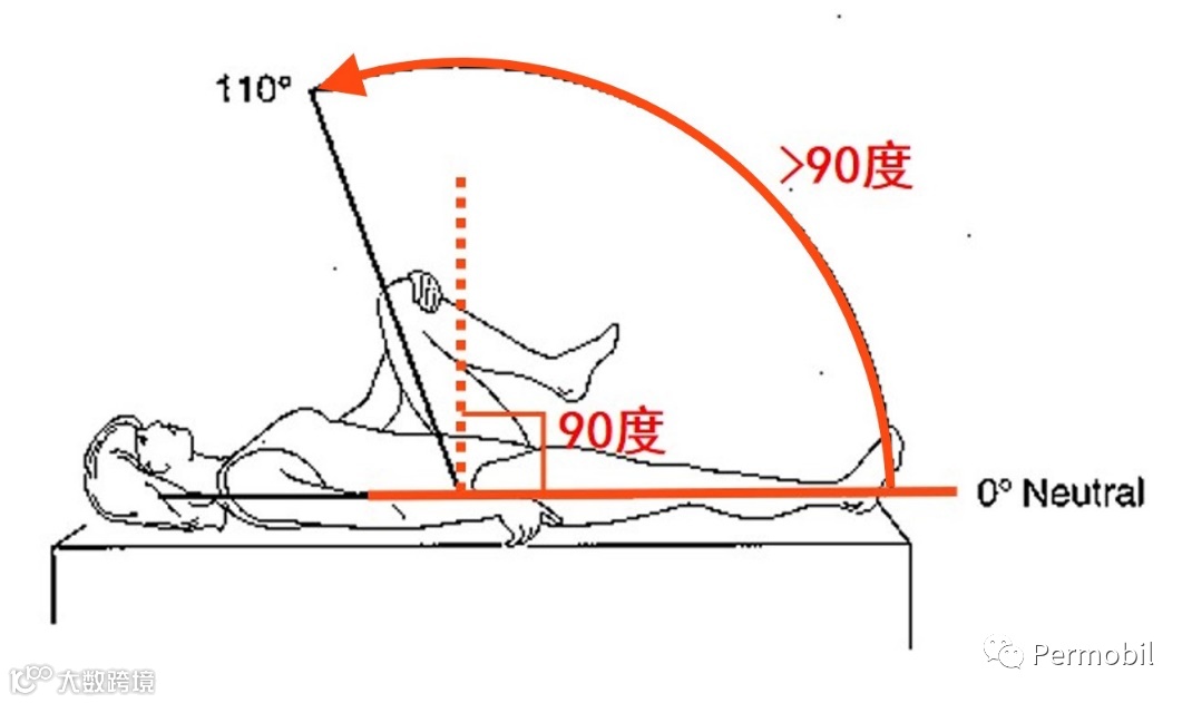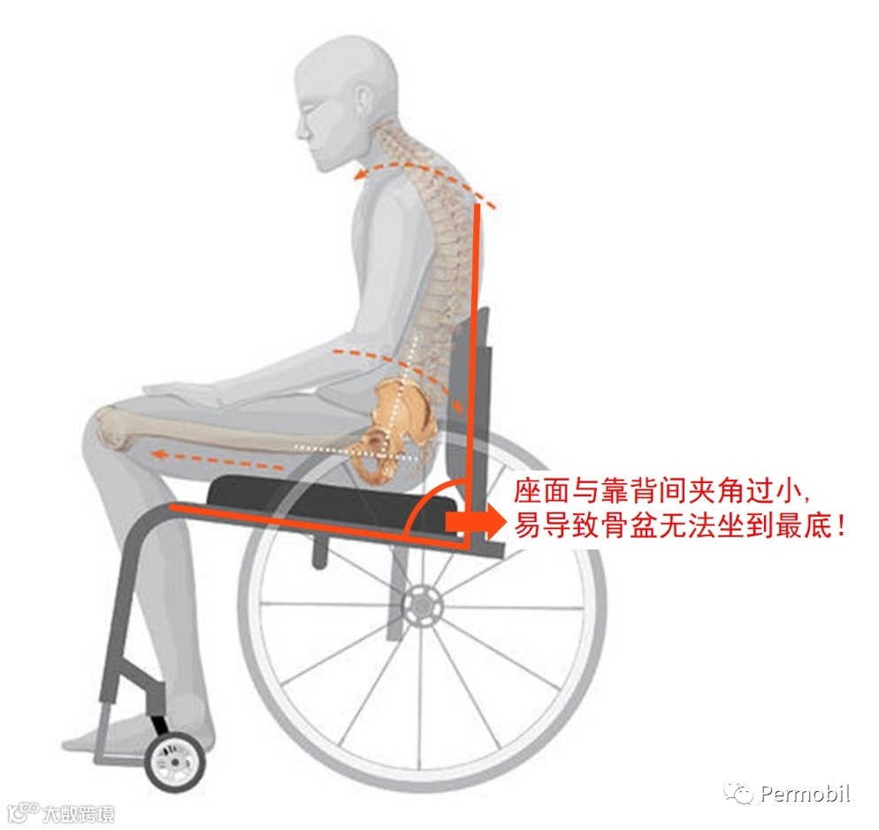 配置前后座高差的前提,则是须确定个人的髋关节活动范围及角度——越大的前后座高差会使整体下肢摆放的位置越向胸口方向靠近,若是髋关节有活动度受限情形,弯曲角度无法超过90度,则无法完全坐进如此配置的轮椅中,可能代偿成为骨盆后倾的不良坐姿。