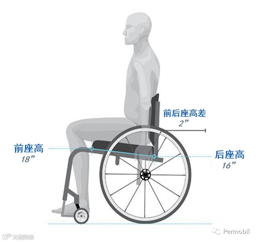 前后座高差的设定,过与不及都会对使用者产生负面影响,不足的座面坡度会造成用户难以维持直挺的坐姿,反之过大的座面坡度则会增加转移位的难度。一般来说,使用上肢进行手动轮椅推行的成人,2寸的座高差为较普遍的配置建议。