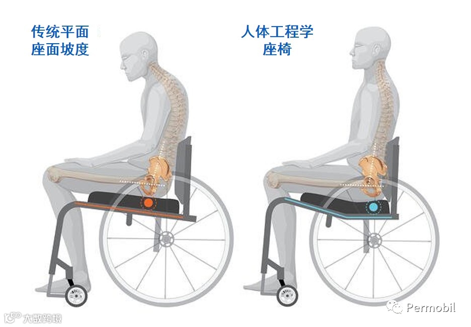 人体工程学座面的向上弯折处,为臀部最后侧向前量测至股骨大转子的长度加上1到2寸之长度,如此设定的意义即是将您的坐骨结节与股骨头放置在椅面平坦的部分,而向上倾斜弯曲处能够阻挡在推行及移动过程中臀部向前滑动的趋势,达到使用车架形状来协助摆位的目标。与传统平面斜坡椅面相比,人体工程学座椅使得座面与靠背保持更打开的角度,符合身形的座面使得股骨能够摆放的更为水平,骨盆与脊柱尽量保持在正中位置及维持自然生理曲度,促进您在轮椅上呈现直立提拔的坐姿,从而实现理想的坐姿摆位及坐姿压力分配,并进而提升您的整体功能发挥和坐姿耐受度。