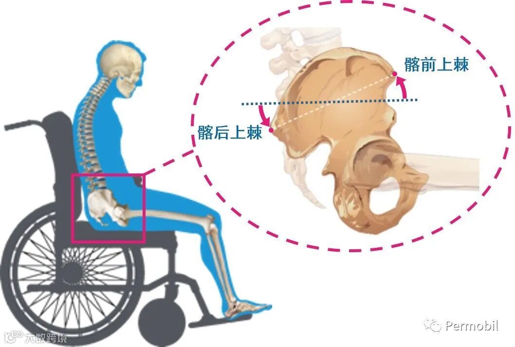 关于坐姿摆位,骨盆后倾(Posterior Pelvic Tilt)合并驼背坐姿是轮椅上最为常见的不良坐姿,但是只要我们多加注意,预防和避免这种不健康坐姿并没有那么难。想要避免骨盆后倾,首先我们要了解它是如何形成的。其字面意思即:骨盆呈现向后滚动后前滑至如同下图——骨盆后方低于前方的位置。