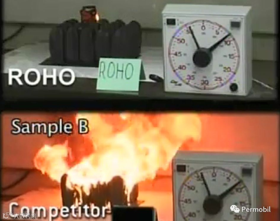 为了最大程度保护使用者的安全,ROHO还会进行防火测试,以确保坐垫不会着火。(注:“不会着火”指的是在明火作用下不引起伤害人身安全的火苗,而非在明火作用下不会损坏坐垫)。