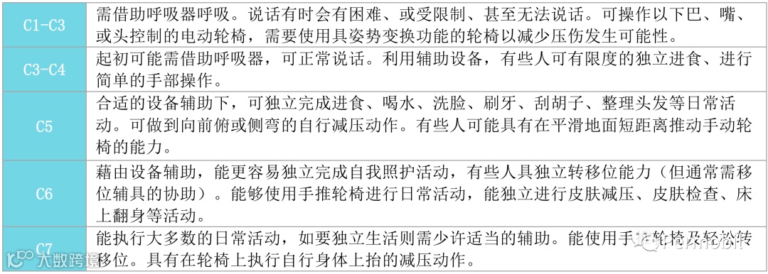 因为颈椎段的脊髓损伤四肢都会受到影响,所以其上肢功能基本上会出现不同程度的受限,而上肢的能力直接与日常生活上的操作及手动轮椅推行相关,所以这里我们将颈椎损伤定义为“高位”脊髓损伤。