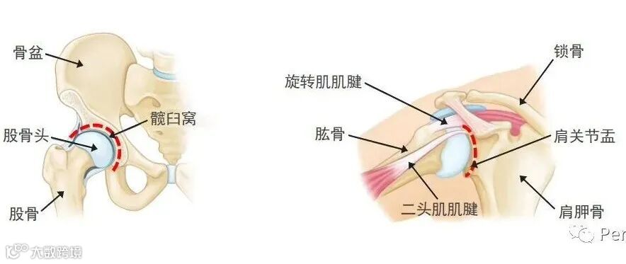 肩关节及髋关节在关节分类上同为相近之类型,然而您可以在上图中观察到,红色虚线处分别标出了两者在解剖结构上相异的关节囊包裹程度——我们可以发现两者明显的差距,那就是肩部的关节囊相对非常浅小。您可以这样想象,髋关节就如同放在小碗中的鸡蛋,它能滚动的范围虽然较小,却不容易掉出碗外;而肩关节像是放在浅碟中的鸡蛋,它可以滚动的范围相对大,但在滚动过程中掉出碟子外的风险,就比放在碗中来的高许多。回想一下,以前是不是曾经听过“肩膀脱臼”,但几乎没听说过“大腿脱臼”,对吧?