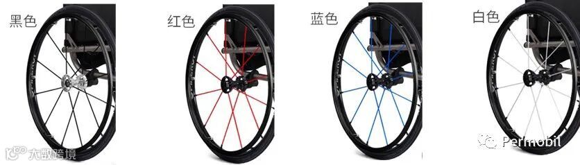 该款后轮框应用PBO超级纤维:每根辐条都含有3万多股PBO纤维辐条,强度是钢的3倍,重量只有钢的一半。更有4种颜色可供选择, 满足使用者对轮椅更为个性化的需求。