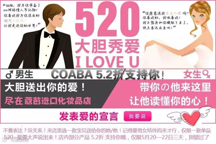 ~520~快来COABA蔻芭进口化妆品泉舜店大胆秀爱吧!转发此条消息到朋友圈,即可在5.20—5.22三天内,到店享受部分单品 5.2折 的大大优惠!记得要男女结伴而来哦~只能帮到你这里了