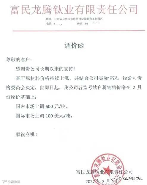 2月23日至24日,泛能拓、特诺相继发出提价通知。泛能拓称,自2022年4月1日起,公司将把在EMEA地区销售的适用于涂料、油墨、纸张等应用的所有钛白粉产品进行调价,最高涨幅为400美元/吨。