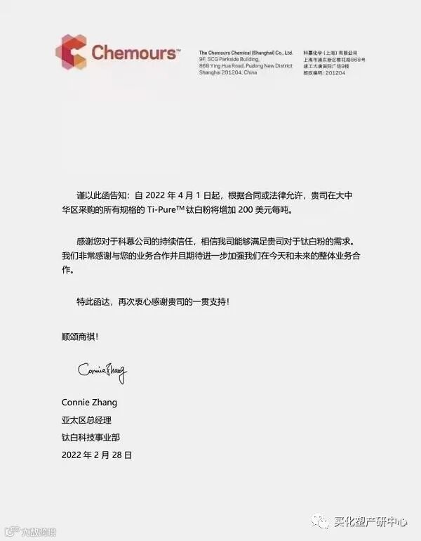 2月28日,科慕宣布自2022年4月1日起,根据合同或法律允许,在大中华区采购的所有规格的Ti-PureTM钛白粉将增加200美元/吨。