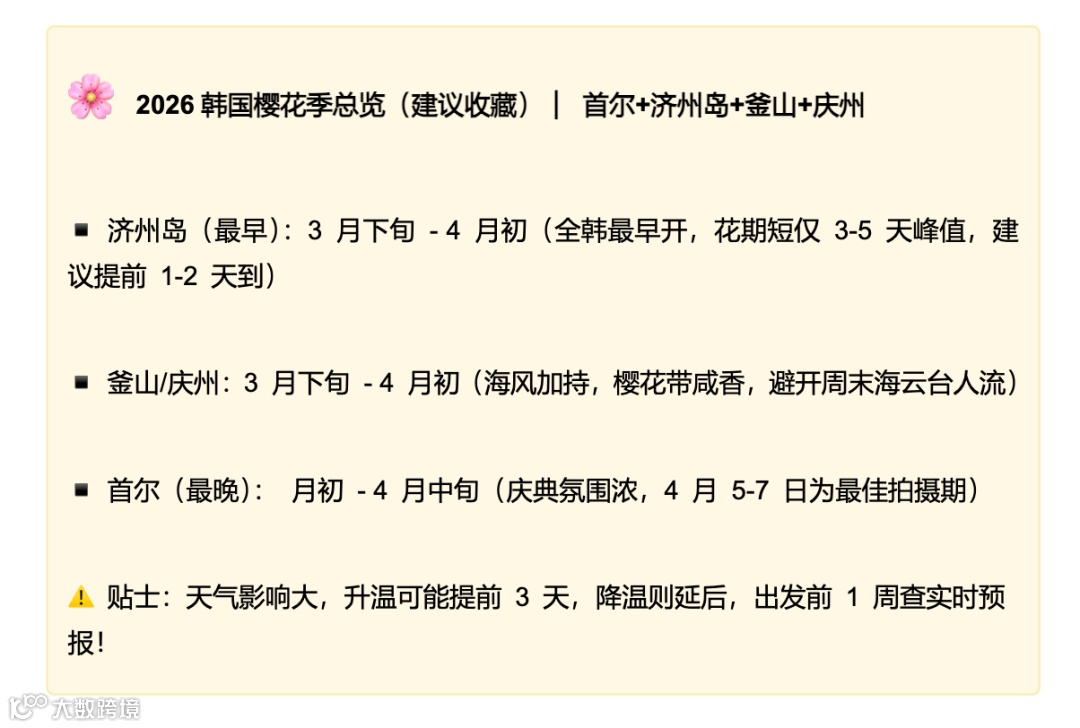 2026年韩国樱花季受气温影响,花期较往年提前3-5天,从南部济州岛率先绽放,一路向北蔓延至首尔,形成绝美粉色花廊。这份攻略精选首尔、济州岛、釜山、庆州四大赏樱圣地,精准花期、宝藏点位、独特玩法全覆盖,干货满满易收藏,带你沉浸式邂逅韩国春日限定美好~