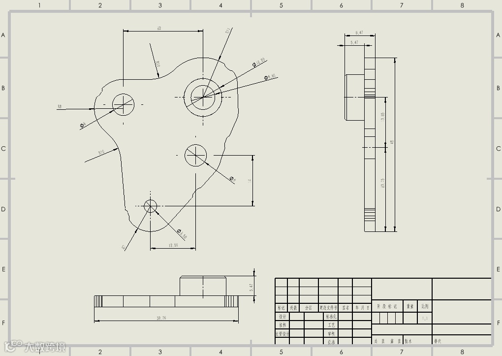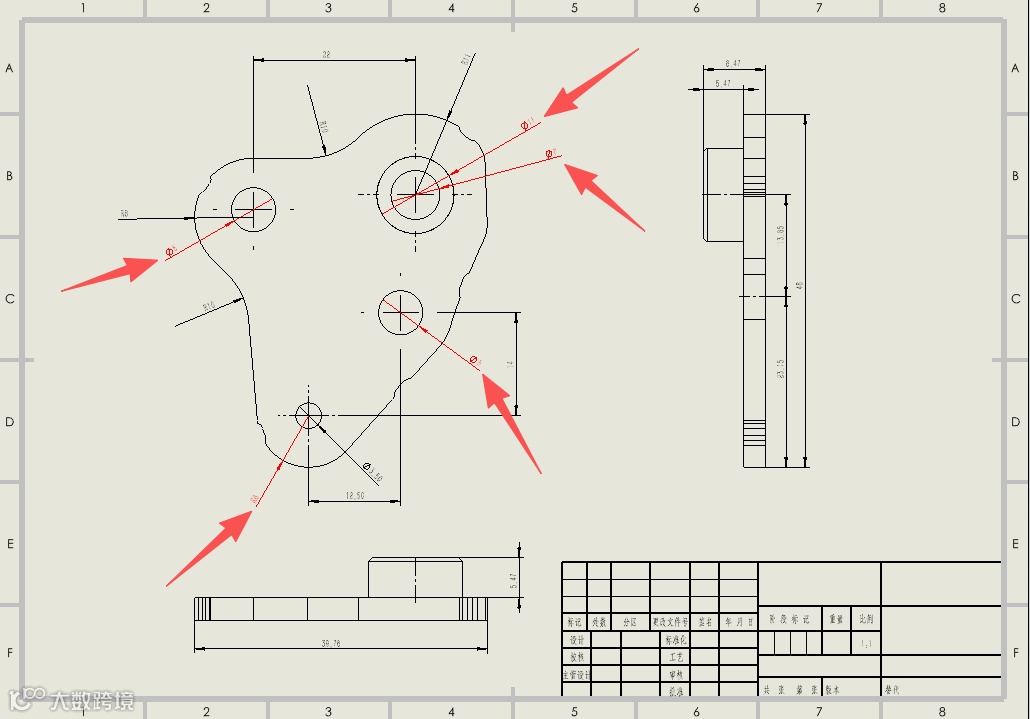 3. 完全显示覆盖尺寸:回到工程图后,所有的覆盖尺寸都将以设定的颜色,显示在工程图中。