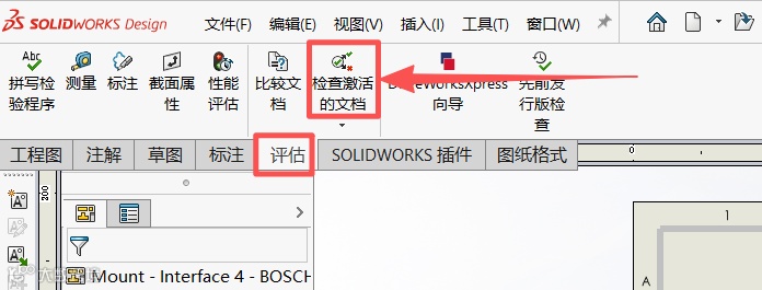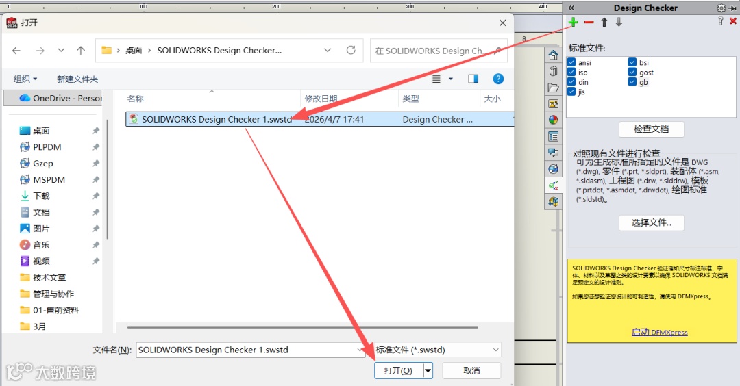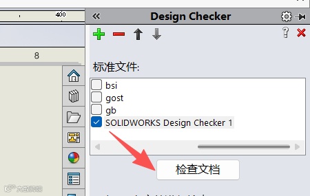 5. 运行检查:关闭SOLIDWORKS Design Checker编辑窗口,在需要检查的工程图文件中,再次点击【评估】->【检查活动文档】。在右侧打开的Design Checker任务窗格中,点击“添加标准”,选择刚才保存的模板文件并运行“检查文档”。
